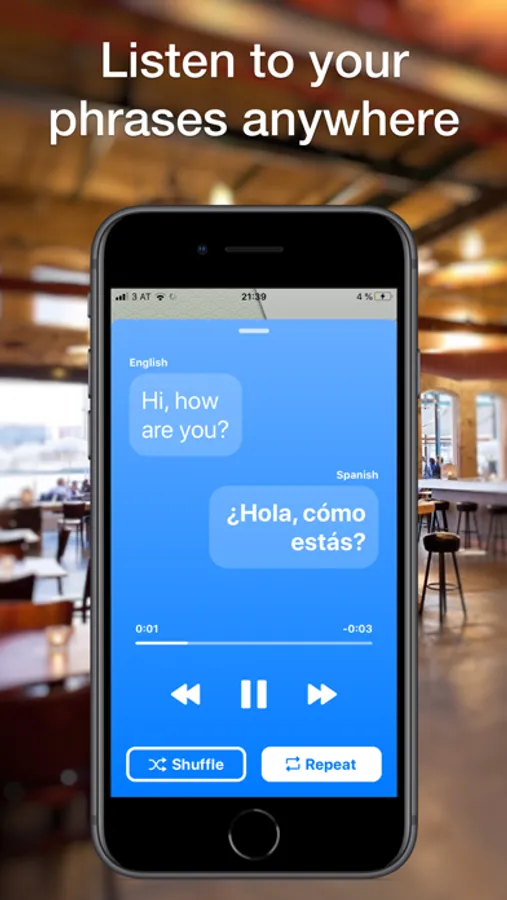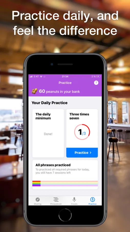 Lingophant works with audio clips, authentic and with the correct pronunciation. Want to remember a new word? Hold a button and record a native speaker. Or ask your teacher to record, and download their phrases. Lingophant automatically creates a practice card and optimises the intervals between your practicing.