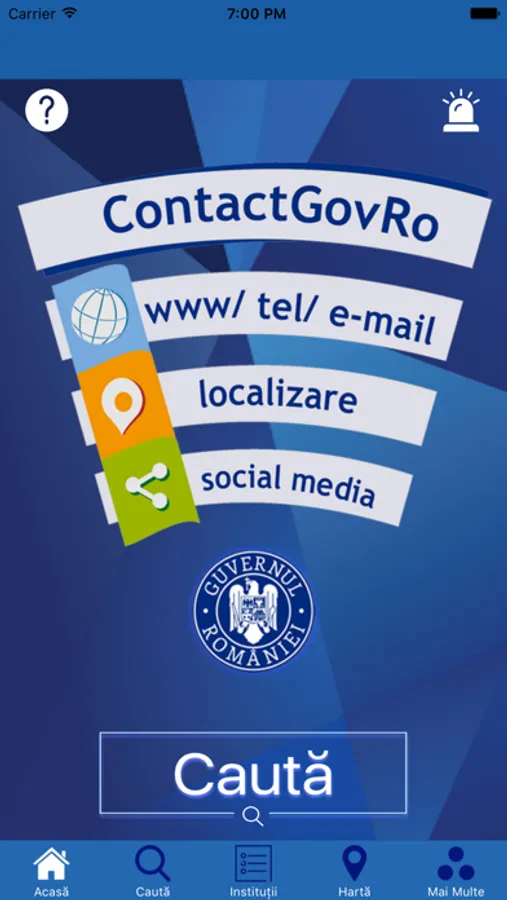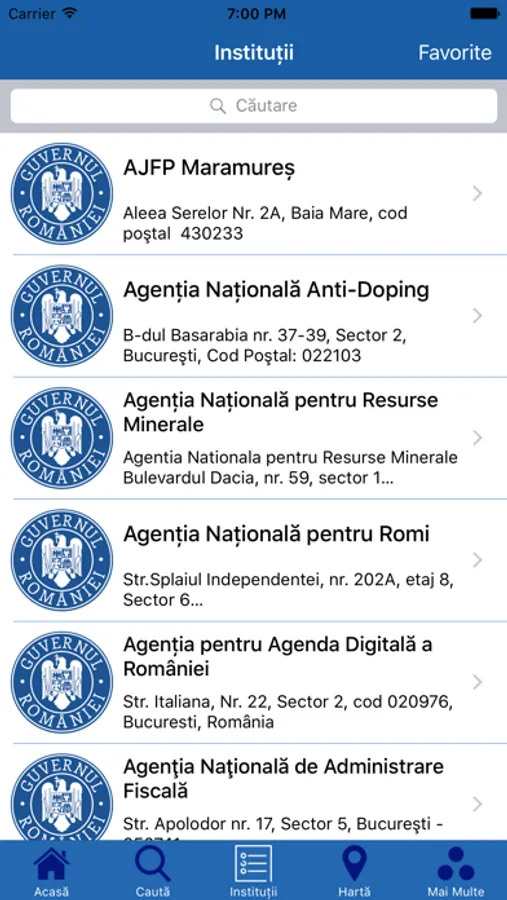 Tipurile de instituții care pot fi regăsite în aplicație: ministere, administrații, agenții, autorități publice centrale, birouri, case de pensii, centre, comisii, comitete, consilii, departamente, gărzi, inspectorate, inspecții, institute, oficii, prefecturi, unități executive, ambasade, consulate etc.