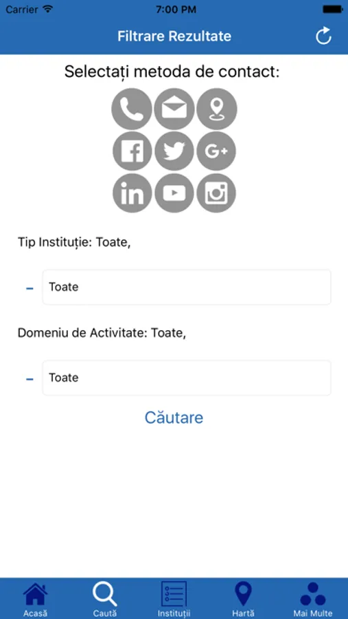 Platfoma contact.gov.ro oferă facilităţi de căutare a datelor de contact prin utilizarea de filtre după cuvinte cheie, judeţ, tipul instituţiei şi domeniul de activitate.