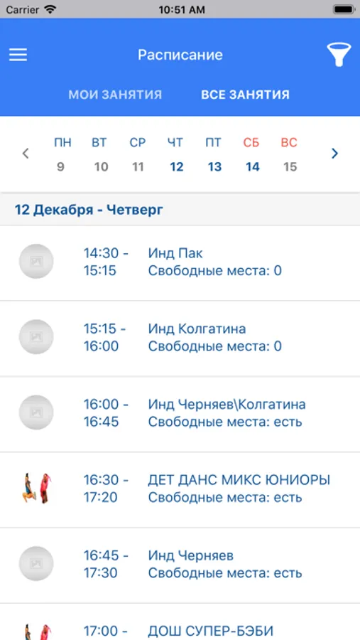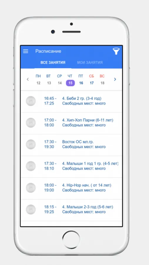 Приложение позволяет видеть полное или только свое расписание уроков, открытые абонементы с оставшимися занятиями, операции по оплате занятий.