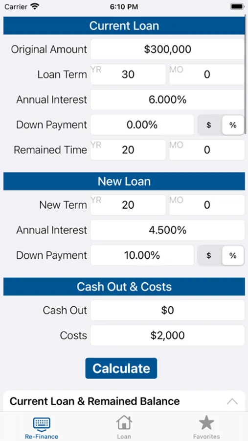 - Calculate a new loan based on remained loan balance (refinance). This function allows you to re-finance your current loan with a new interest rate. It support the calculation of saved interest in case your current loan is re-financed into a new loan with lower interest rate. The summaries of current loan & new loan are also displayed for your reference.