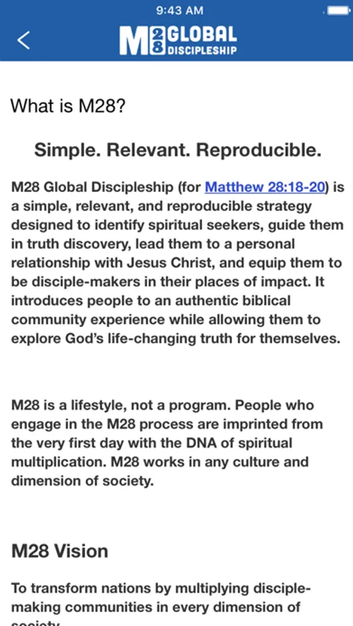 Simple. Relevant. Reproducible. M28 Global Discipleship is a simple, effective, and reproducible strategy to identify spiritual seekers, guide them in truth discovery, lead them to a personal relationship with Jesus Christ, and equip them to be disciple-makers in their circles of impact. It introduces people to an authentic Biblical community experience while allowing them to explore God's life-changing truth for themselves. M28 is a lifestyle, not a program.