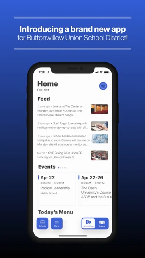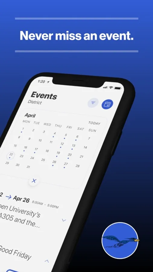 The event section shows a list of events throughout the district. Users can add an event to their calendar to share the event with friends and family with one tap.
