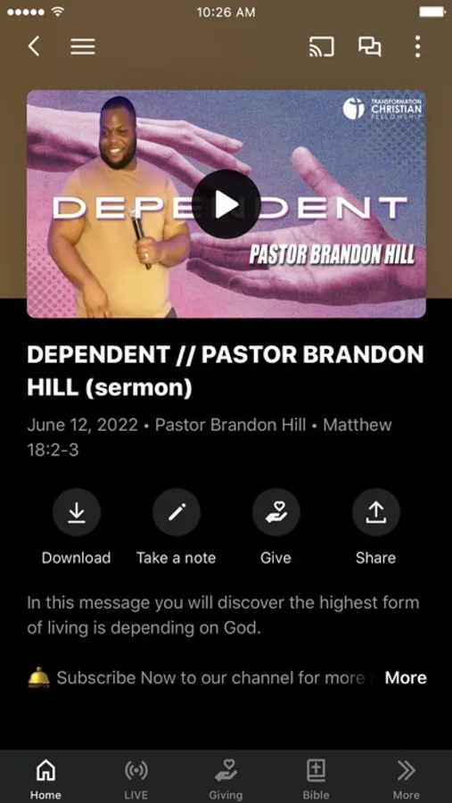The Transformation Christian Fellowship App features life-changing sermons from Pastor Brandon Hill, uplifting video content from Transformation TV, weekly inspiring devotionals, podcasts, upcoming events, and relevant information about Transformation Christian Fellowship. Additionally, you can share content with your friends via Facebook, Instagram, Twitter, or Email.