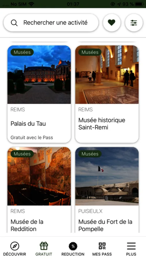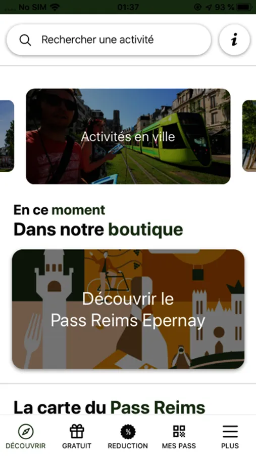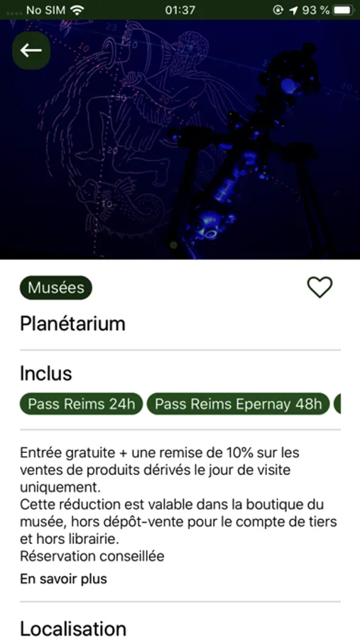 L’application Reims City Pass permet à son utilisateur de consulter la liste des sites partenaires du Reims City Pass même sans connexion internet, et pour chacun d’eux d’obtenir des informations détaillées : Nom, Photo(s), description, adresse postale, localisation sur la carte google Maps, horaires, lien site internet, téléphone, contact, événements liés, prestataires aux alentours. Ainsi il dispose d’un guide touristique numérique interactif pour l’accompagner pendant son séjour dans la région de Reims.
