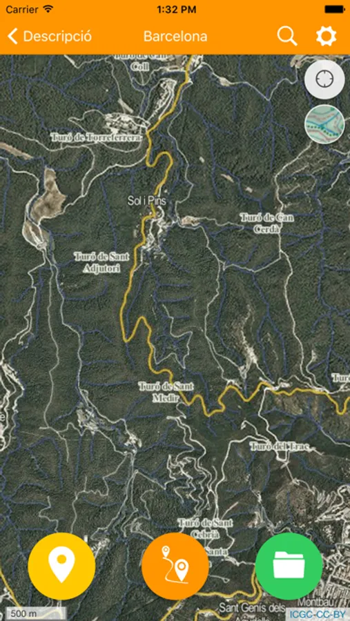 L’aplicació permet la descàrrega i visualització de la cartografia de l’ICGC, tant del mapa topogràfic com de la ortofotomapa.