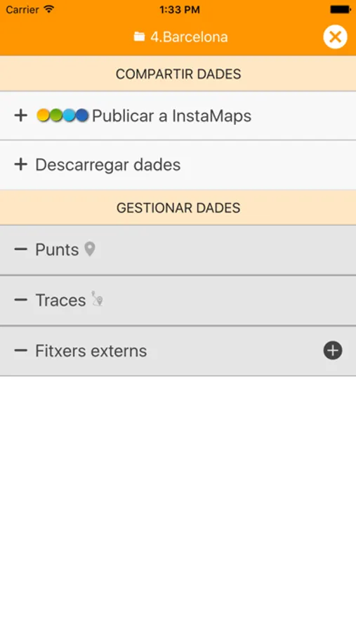 • L’aplicació permet pujar rutes i punts que estiguin continguts en arxius (fitxers externs). Formats: .gpx, .kml i .geojson.