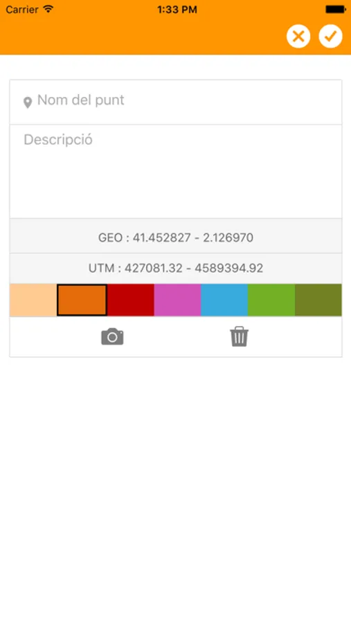• Creació de punts sobre el mapa, bé a partir del posicionament del propi mòbil, bé realitzant un clic llarg sobre la cartografia allà on volem situar el punt. Podem posar nom al punt i descripció, també associar-hi fotografies i escollir-ne el color.