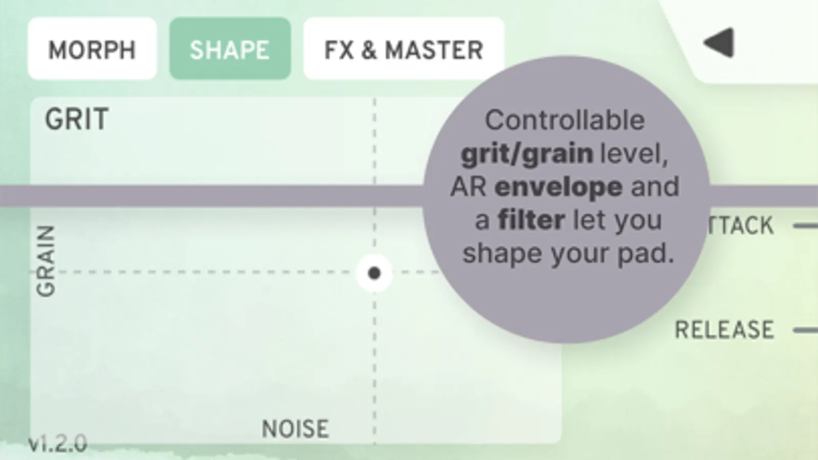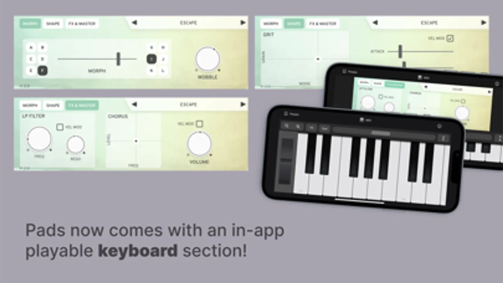 Pads is basically a wavetable synthesizer with a noise/grain generator and a high cut filter. With a carefully developed ”wobbler” that detunes the waveforms and makes small inconsistencies to several internal parameters and a nice sounding chorus, this synthesizer is able to create some really interesting and non-statical pad sounds.