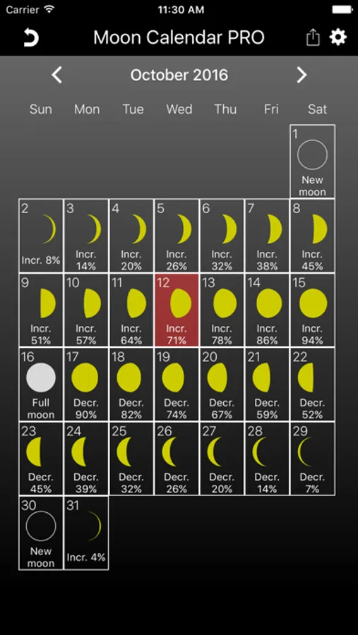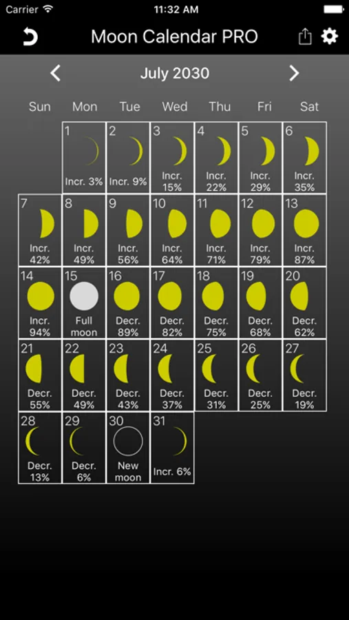 This moon calendar app shows you the phase and percentage of visibility of the moon for each calendar day. Download now for free!