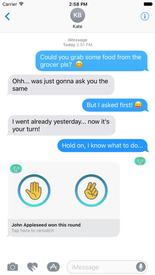 Having a dispute or trying to decide who does the errand? Settle it with the classic way: by playing a round of rock-paper-scissors. With this iMessage extension you can even do it from afar, solving dead-locks and ending arguments on the go.