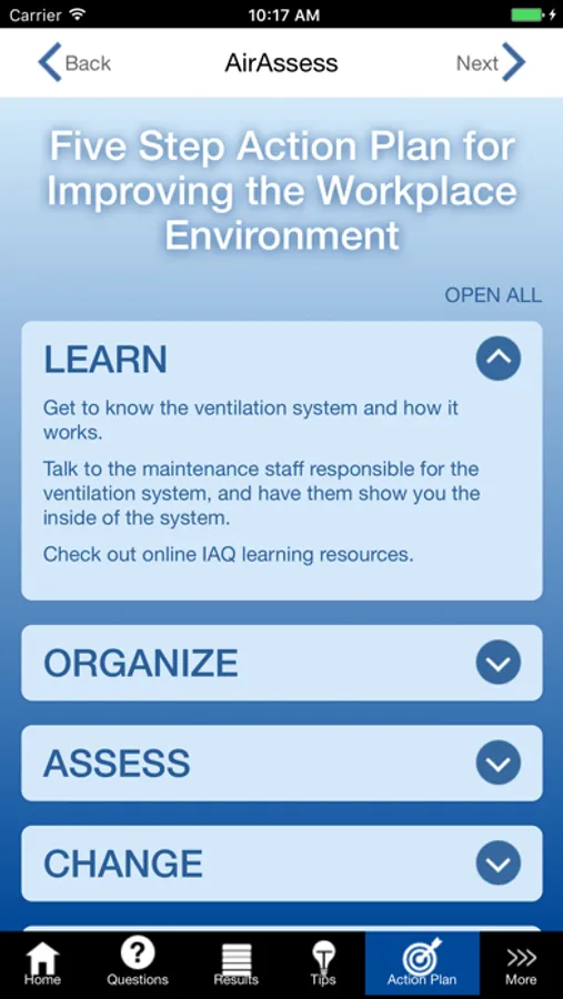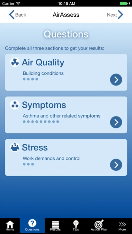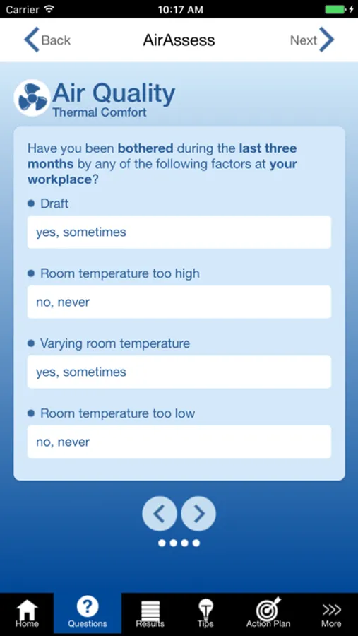 Indoor air quality issues at work can be caused or aggravated by a number of factors. The interrelationships between these factors can be quite complex. By answering some simple questions about your environment, symptoms, workplace stress levels, and allergies, you’ll discover issues which may be related to the air quality in your workplace. This app will look for links and provide you with some ideas to help take action on these air quality issues.