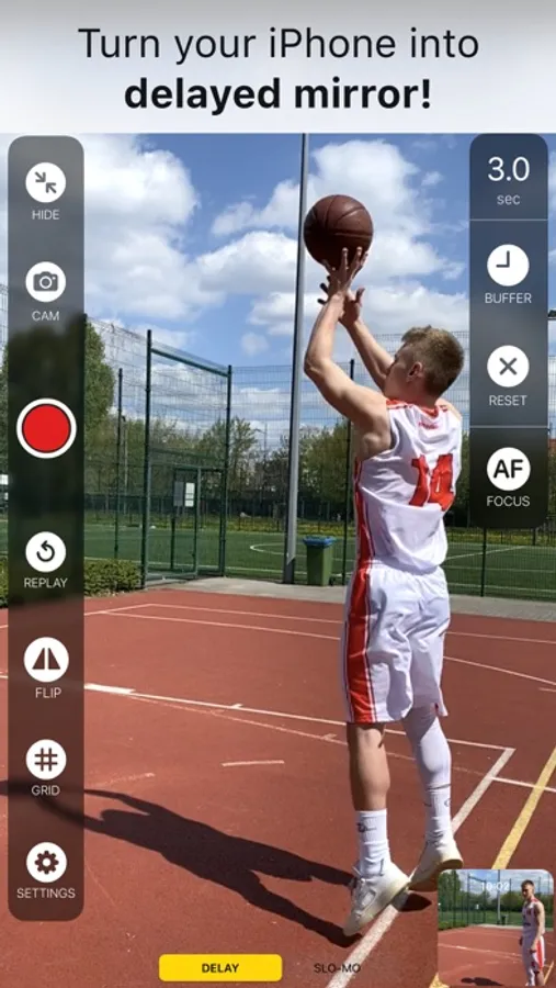 The DELAY Mode continuously shows the delayed video during practice. After setting the buffer time, there's no need to record and replay manually. The video feedback will be on until you reset the buffer or hit the exit button.