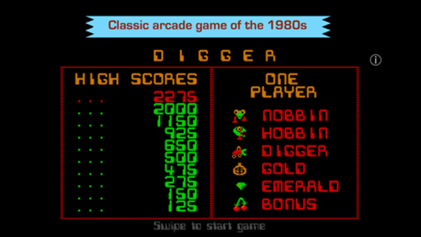 Digger is similar to the other popular DOS games Mr. Do! and Dig Dug. You are placed in an underground maze and can dig horizontal and vertical tunnels through it. At various points on the board are emeralds and bags of gold. Monsters (initially in the "nobbin" form) appear at the top right-hand corner. If earth is excavated from under a gold bag, then the bag will wobble for a few seconds and then drop releasing gold. Falling bags will squash monsters, but they will also squash the digger. The digger has a weapon, which fires in a straight line, but takes several seconds to recharge (taking longer as the levels go higher).