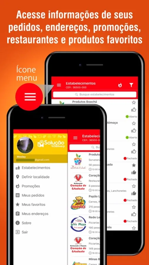 • Após instalar o aplicativo, informe o CEP da sua localização e verá as empresas que fazem entregas na sua localidade: você saberá quais lojas estão abertas e fechadas, o tempo de entrega mínimo e máximo descrito em cada estabelecimento. Para se cadastrar, use sua conta do Facebook, Google ou um e-mail válido.