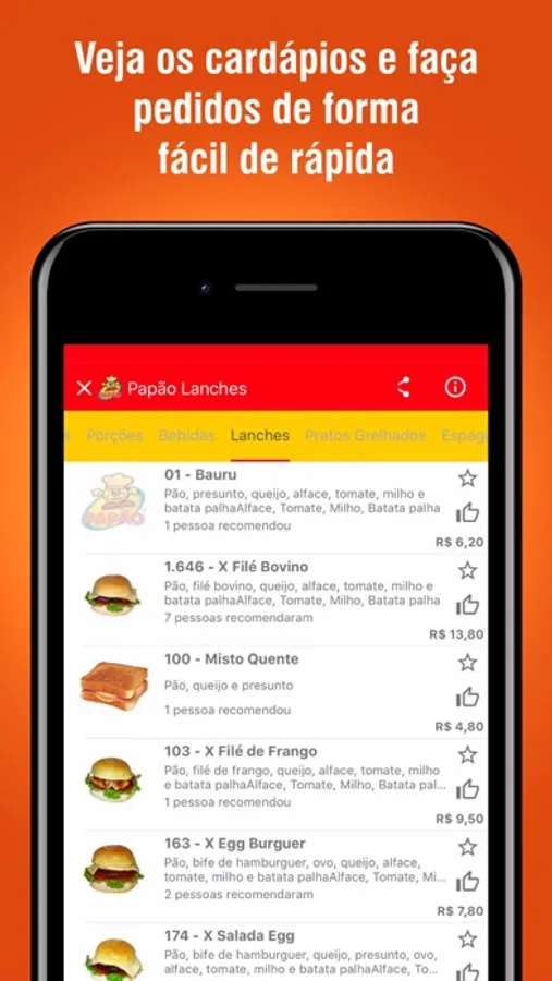 • Escolhido o estabelecimento, será disponibilizado para você o cardápio oferecido pela empresa, dividido por categorias.