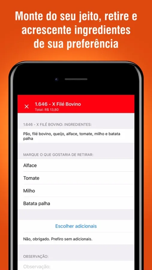 • Na seleção dos produtos é possível ver os ingredientes, retirar e adicionar ingredientes, escolher os tamanhos, selecionar dois sabores, no caso de pizza, e deixar uma observação.