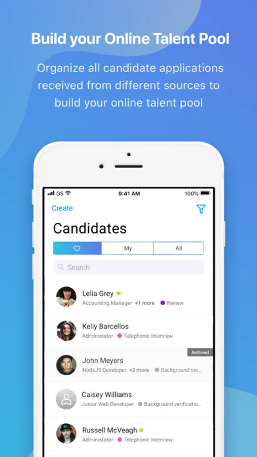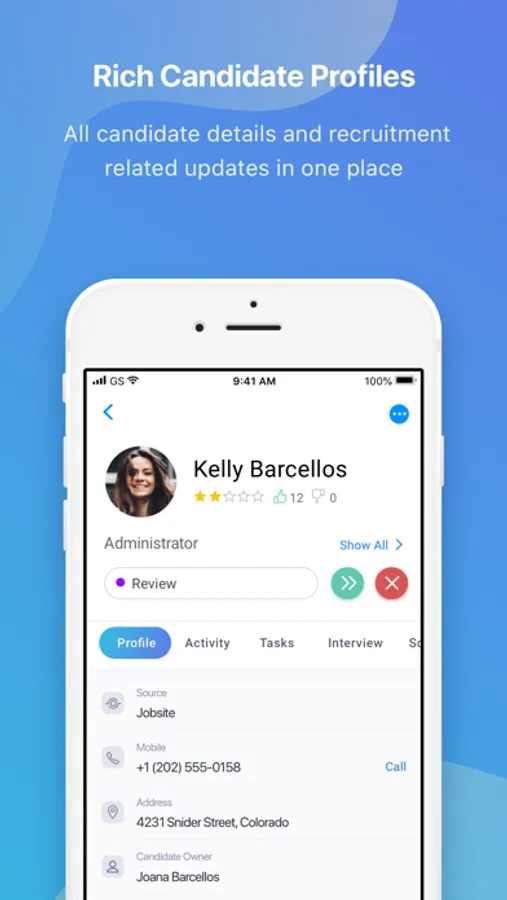With an organized view of candidate information, notes, emails and reviews from your team you can now hire the best-fit using only your mobile device.