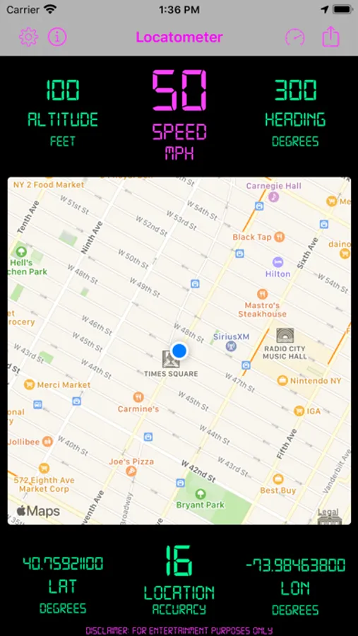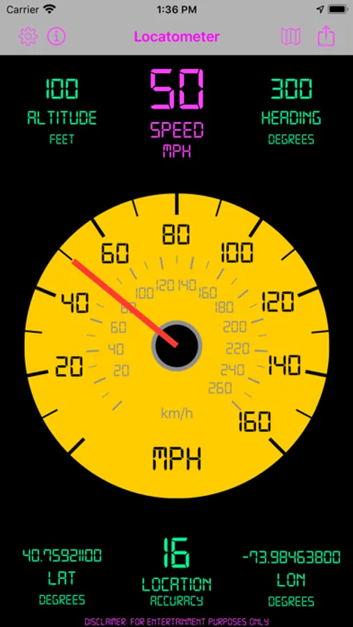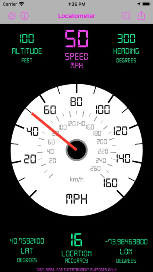 Want to know how fast you are going? Locatometer, short for location meter, displays your speed along with the following information: