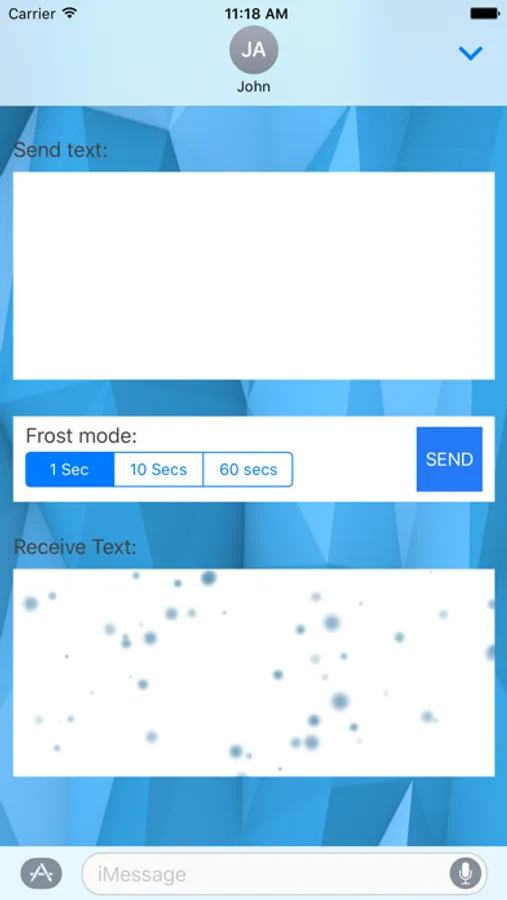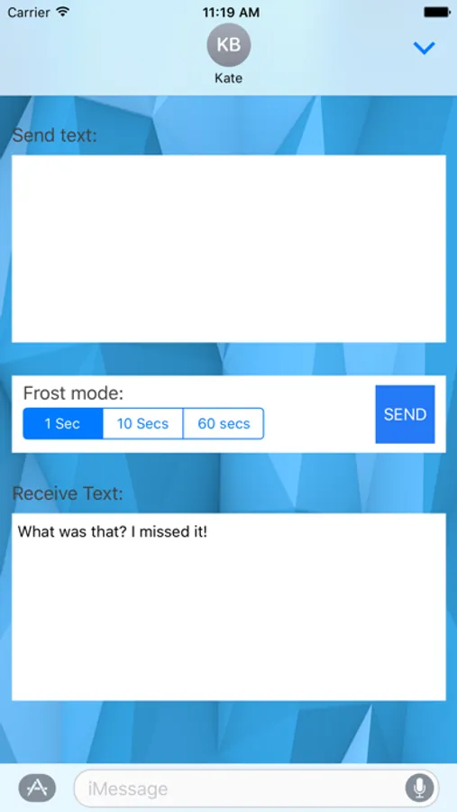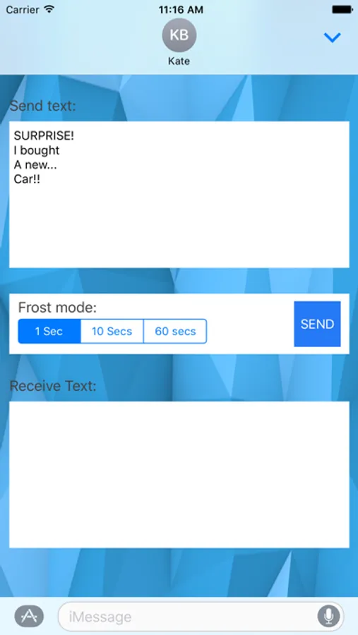 Frost.m lets you send and receive self-destructing text messages on iMessage. Text messages expire 1, 10, or 60 seconds after they are opened, so read them quick! Only the sender knows which Frost mode you will receive.
