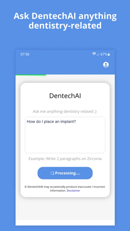• Ask DentechAI: Ask anything related to clinical/technical dentistry and get detailed, accurate answers instantly, including how to or how do I procedures, writing treatment plans, generating social media content & much more. Just simply type your questions and wait for a unique tailored answer.
