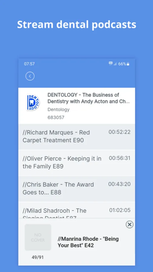 • Podcasts: Stream and listen to your favourite dentistry podcasts from multiple platforms. Find all new and previous podcasts available by using the tab at the bottom to find your podcast station.