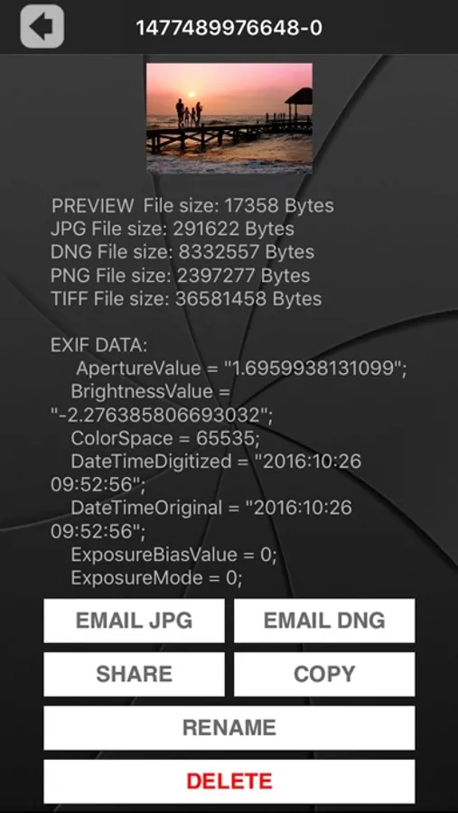 • Full EXIF Data: Complete EXIF data per photo viewable in app and sharable.