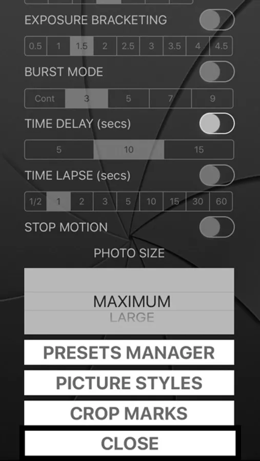 • Settings Presets: Save your favorite camera settings as presets to quickly setup your camera.