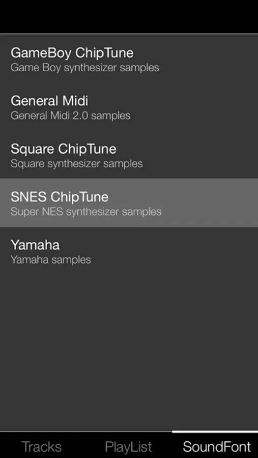 Media player for midi files. You can play midi files with 5 soundfont, Real General Midi, Yamaha XG, SNES chiptune, Square Chiptune, GBA chiptune.