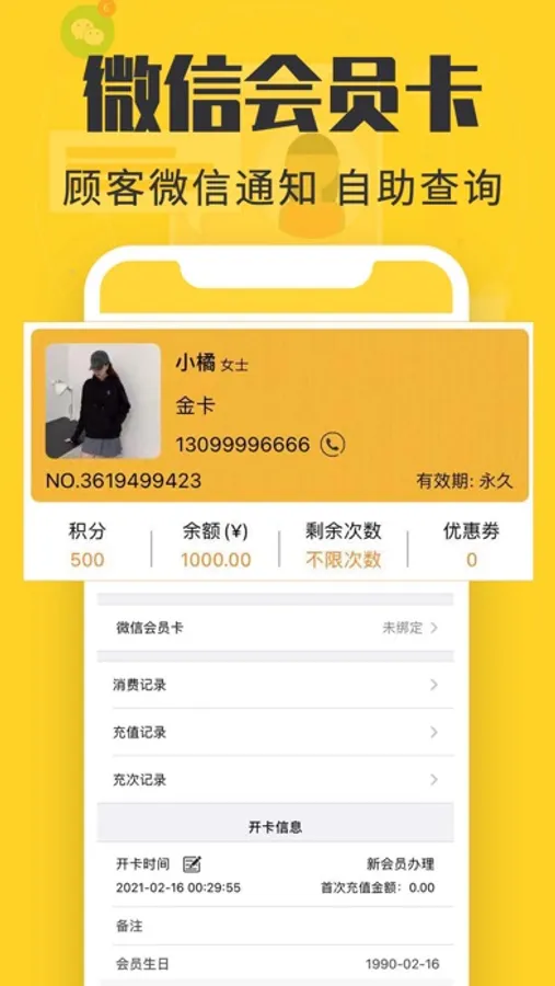 会员查询,会员办卡,会员充值,会员充次,会员积分兑换。可与实体卡片混合使用,支持扫码识别实体卡。