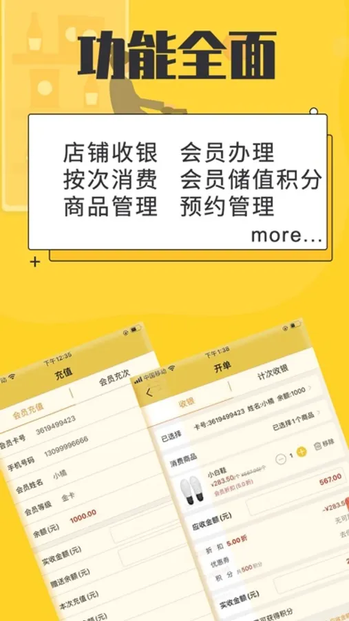 消费收银,按次收银,会员收银,散客收银,储值收银,现金收银,自动折扣,自动积分