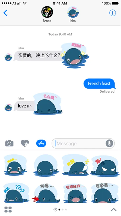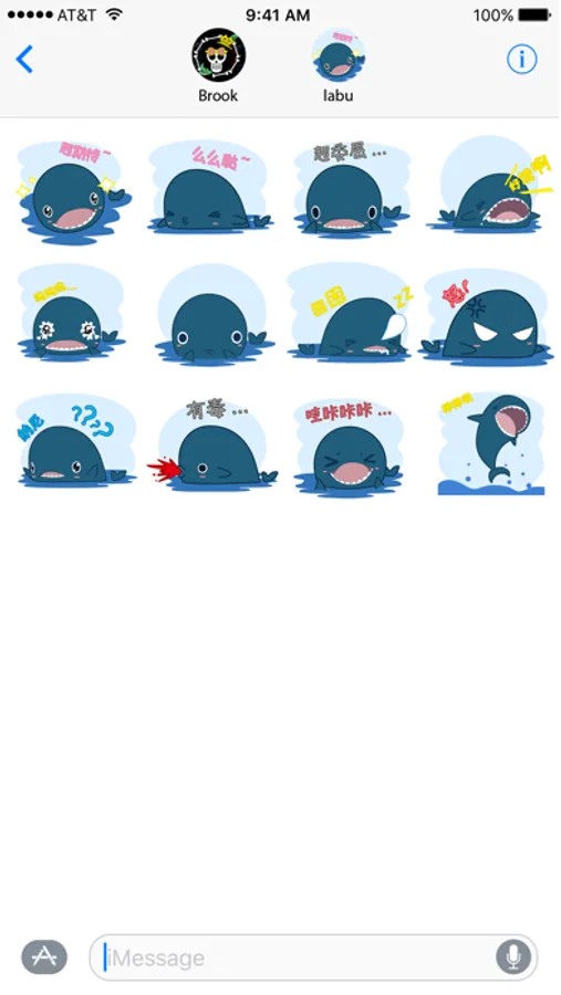 【使用方法】在您成功安装后,在【信息】聊天界面中,点击键盘输入框左侧的应用商店图标,键盘会切换到贴纸表情界面,找到我们的【小鲸鱼拉布】就可以愉快的使用啦^_^