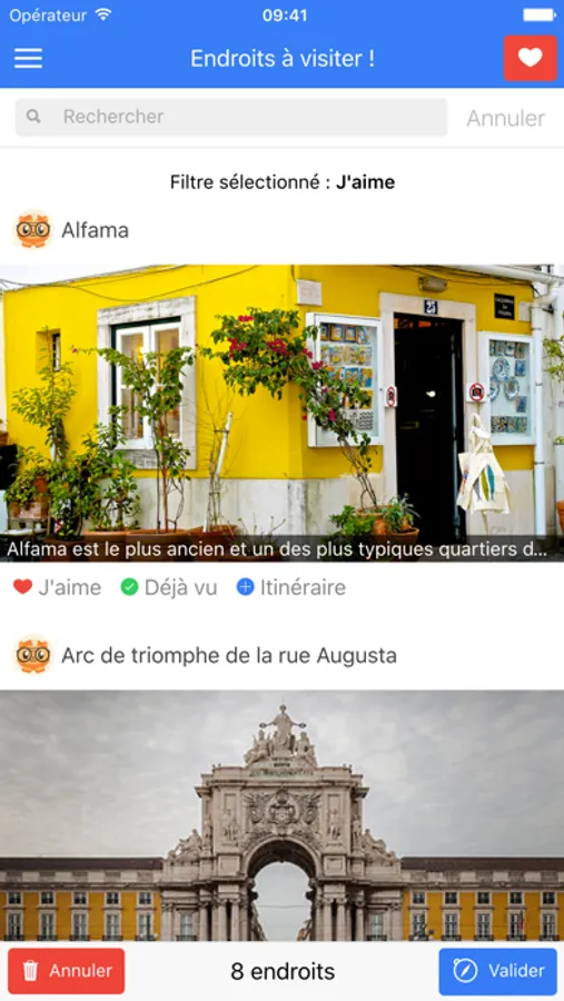 • Possibilité de filter dans la liste les endroits : coup de cœur - déjà vu - itinéraire