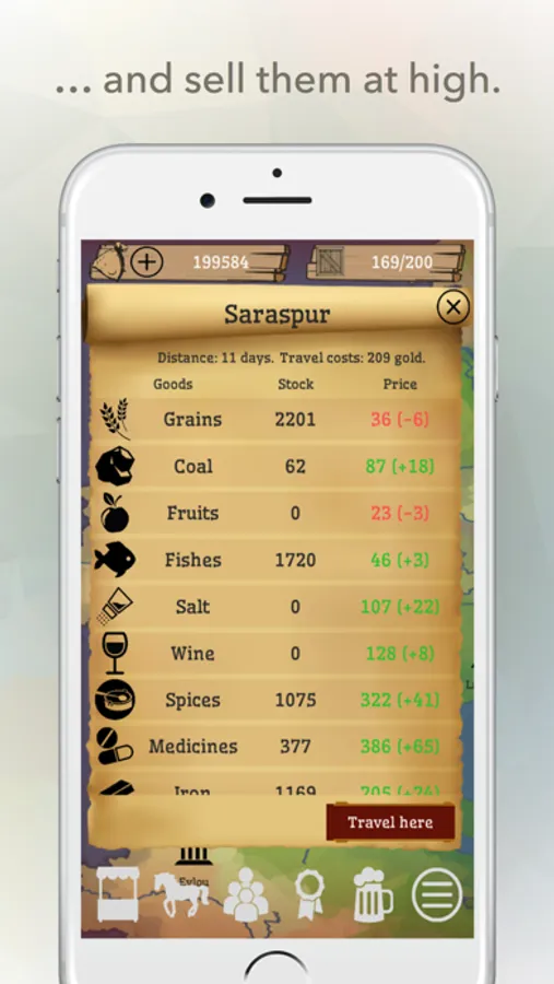 You have plenty of amazing good types to choose from, ranging from bronze to rubies, salt, wine, spices, medicine, fish, fruit, coal, grains and even poison. As you play and earn more money you will be able to trade more goods and upgrade your caravan in order to carry more cargo.