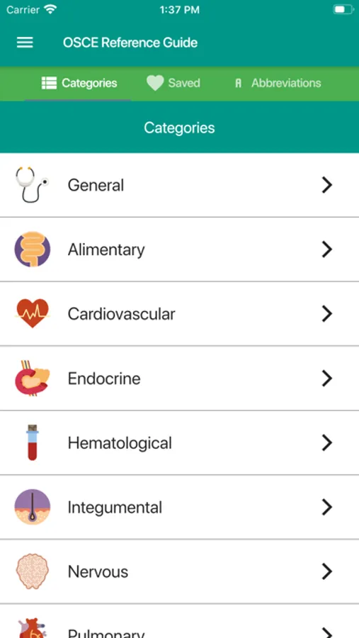 The top level categories included are: General, Alimentary, Cardiovascular, Endocrine, Hematological, Integumental, Nervous, Pulmonary, Rheumatoid, Urogenital, Obstetrics, Pediatrics.