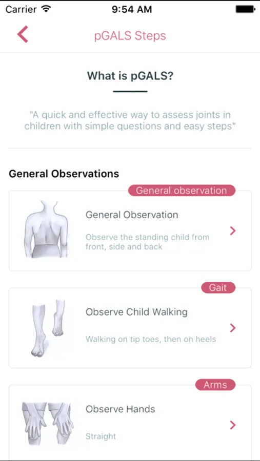 This app is a study aid that takes you through the pGALS (Paediatric Gait Arms Legs Spine) steps with explanatory notes and images and relevant links to additional information.
