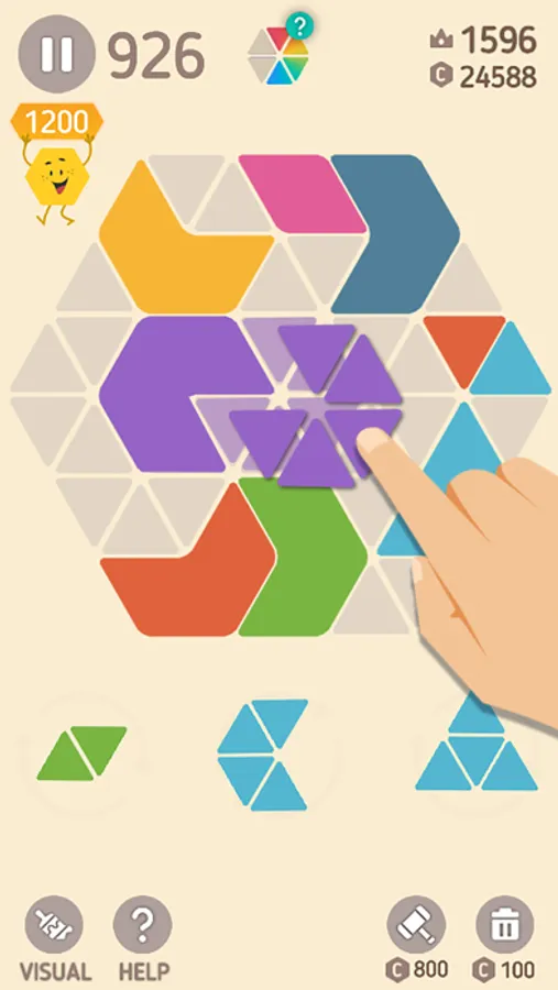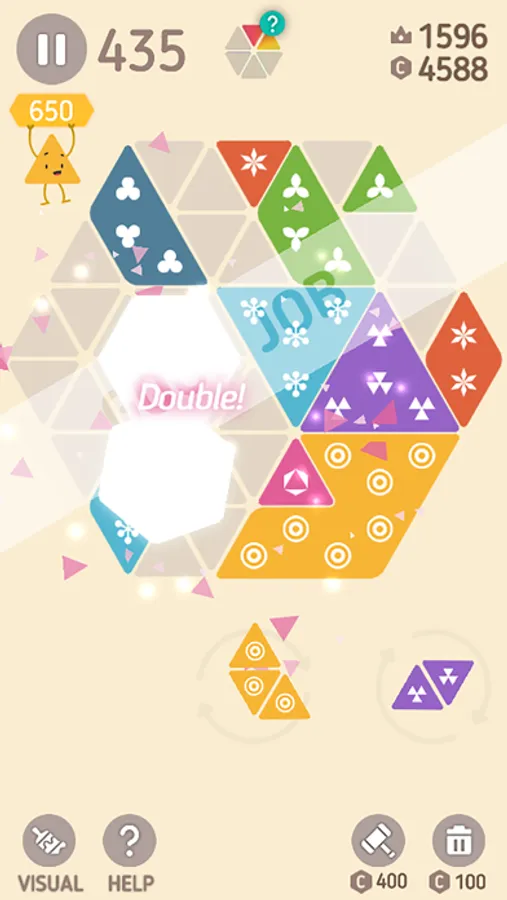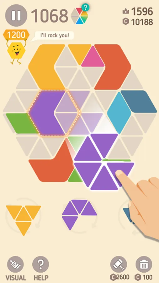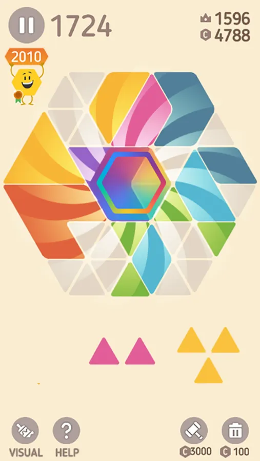 Simply drag the triangles onto the grid and combine them with the same color to form a hexagon! Create as many hexagons as you can to fill up the gauge and create the ultimate Rainbow Hexa!