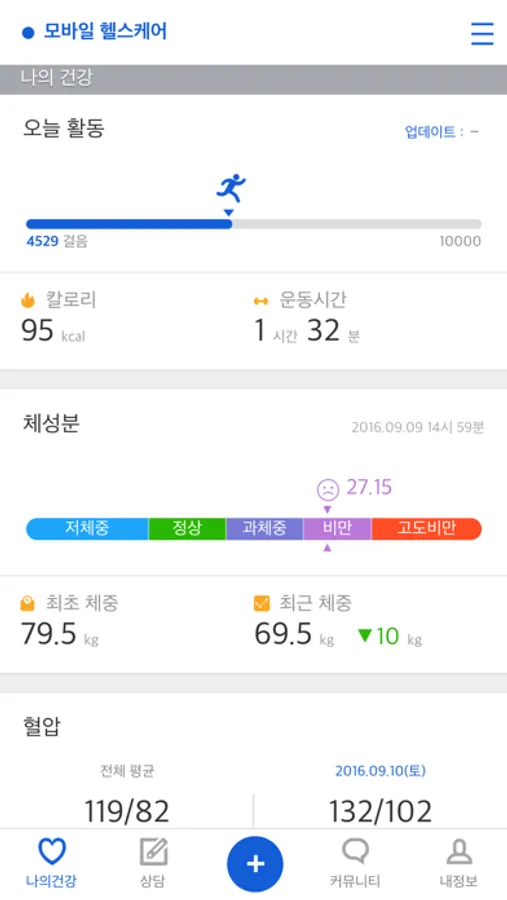 애플의 HealthKit과 동기화를 허용하시면 모바일헬스케어 앱에서 HealthKit의 활동정보(걸음수, 이동거리, 칼로리 등) 데이터를 다양한 Life log와 함께 사용자가 쉽게 분석할 수 있는 뷰로 제공합니다.