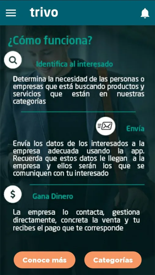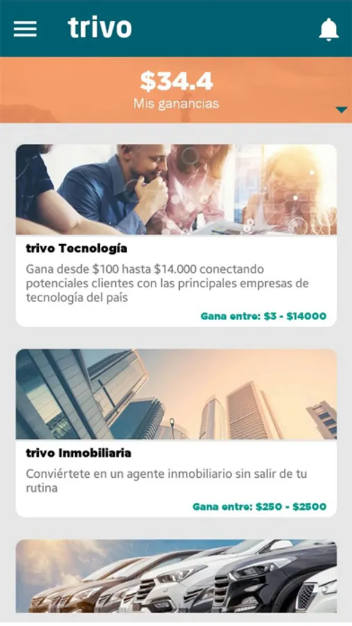 Trivo es la primera aplicación que te genera ingresos por conectar posibles clientes con las principales empresas de tecnología, vehículos, inmobiliaria y seguros del país, con total transparencia, efectividad demostrada y reconocimiento garantizado.
