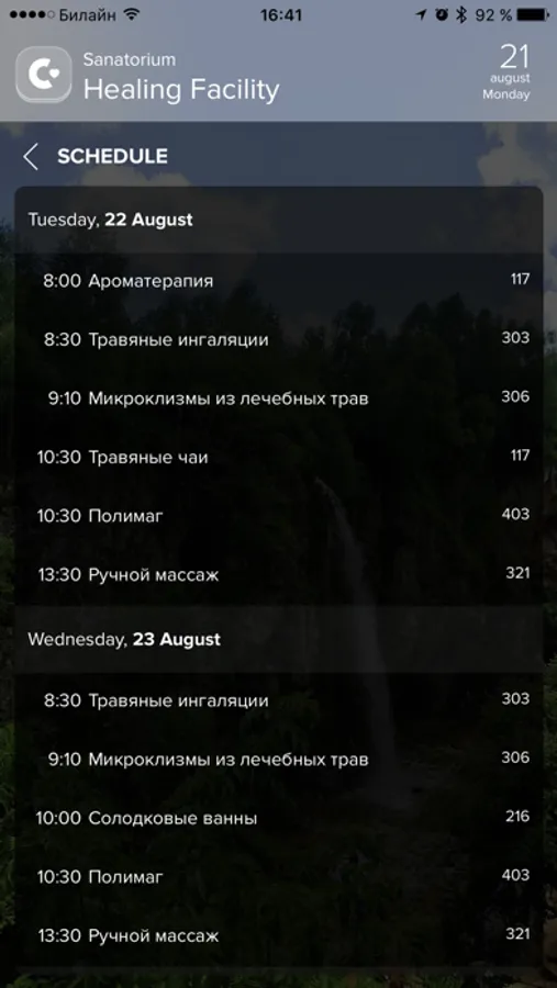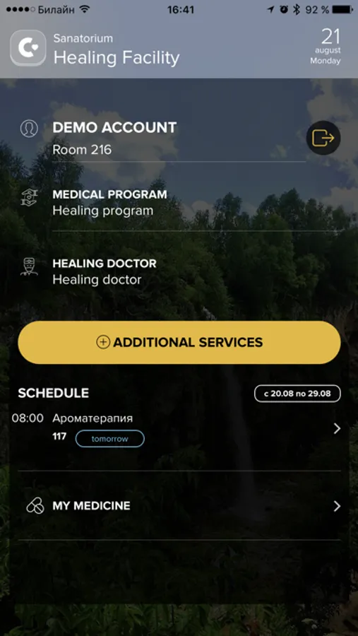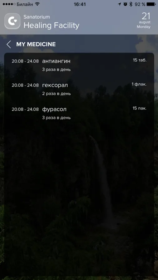 Mobile application for sanatorium's patients: it allows to view common information about services, receive notifications about your medical procedures and schedule updates, view list of prescription medications.