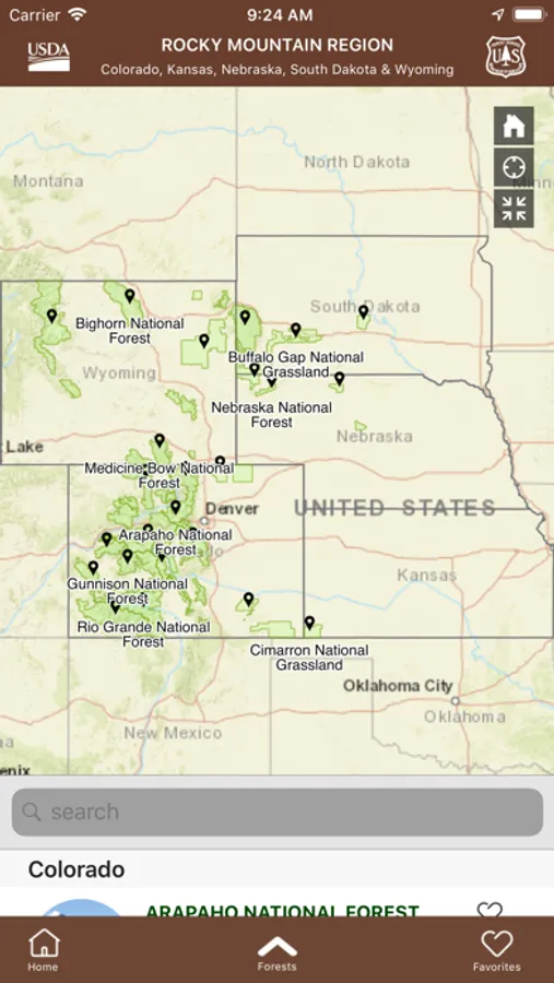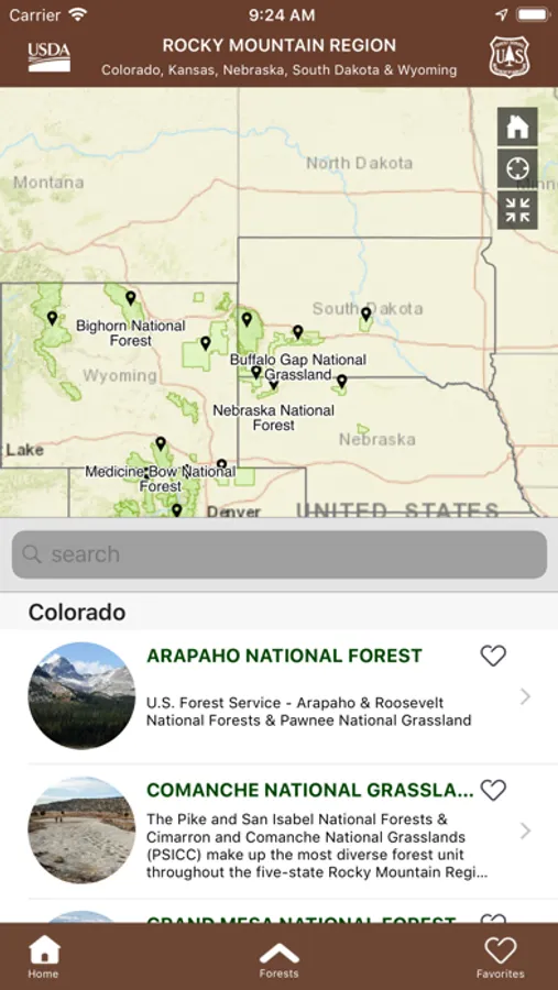 The Rocky Mountain Region’s 17 national forests and 7 national grasslands units in this app include:
