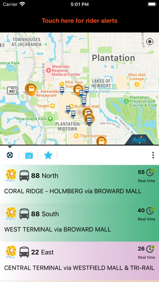 The MyRide Broward app is a real time information product for Broward County Transit customers, providing bus arrival information, bus location and route schedule information for all Broward County Transit bus routes.