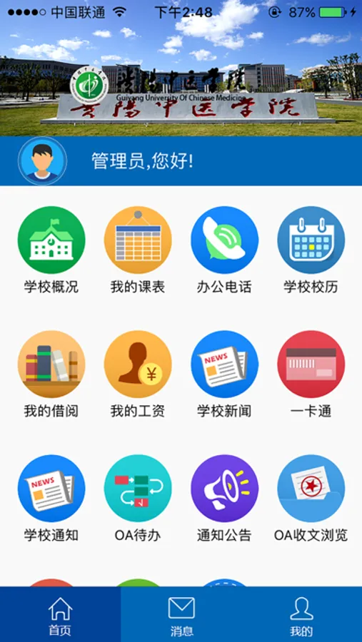 贵阳中医学院移动平台,采用iPhone等智能手持终端设备作为移动终端,通过校园内外、公共场所WiFi环境、移动运营商提供的GSM、GPRS、3G、4G等网络,接入学校的平台系统,应用摆脱地理空间的约束,使用校园提供的信息服务。系统的主要功能包括校园通,周边环境,流程指引等功能