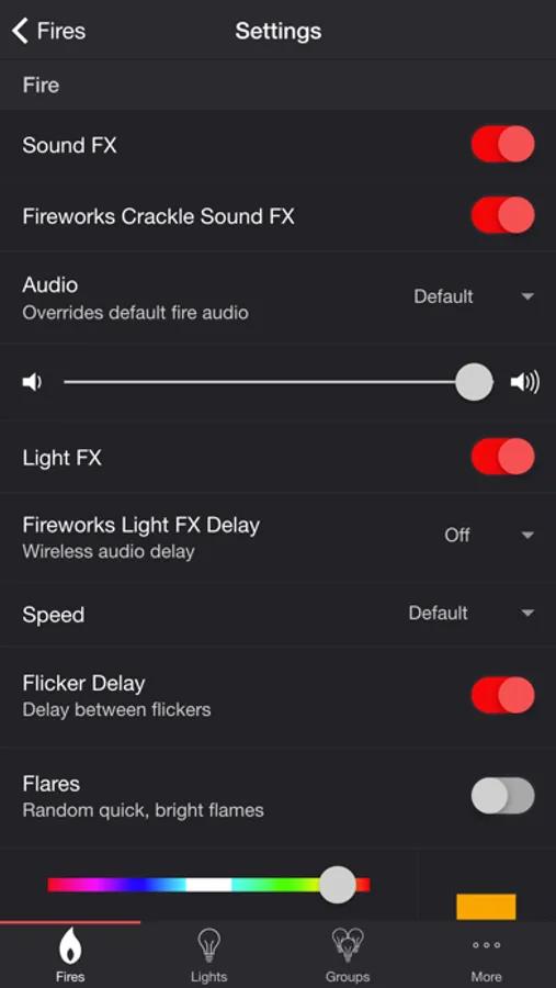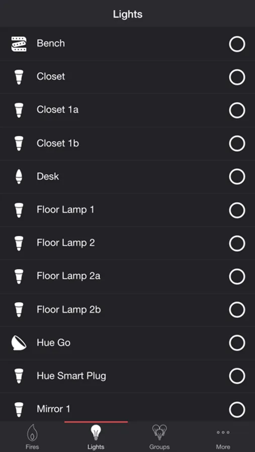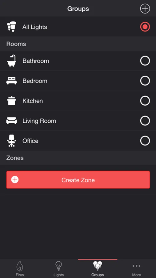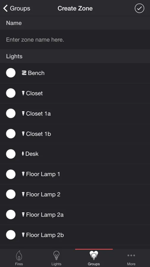 Select one or more lights for your fire light show on the Lights/Groups tab. Choose a group that you set up using the Philips Hue app, or create a new zone in the Firestorm for Hue app. To edit a zone in the list, swipe the item to the left and tap the pencil icon. When you add, remove, or change lights, pull down the list to refresh.