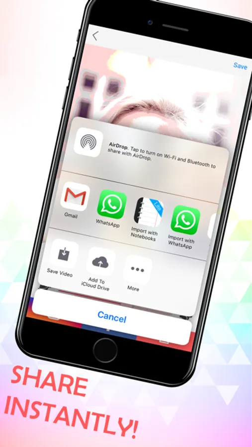 • Share your videos via Facebook, Instagram, WhatsApp, Messages etc. directly from FilterPop.