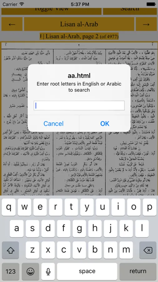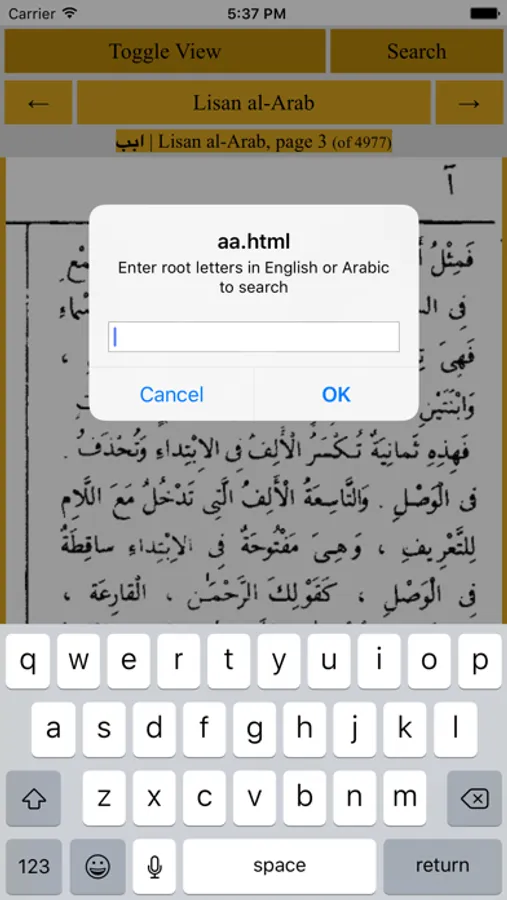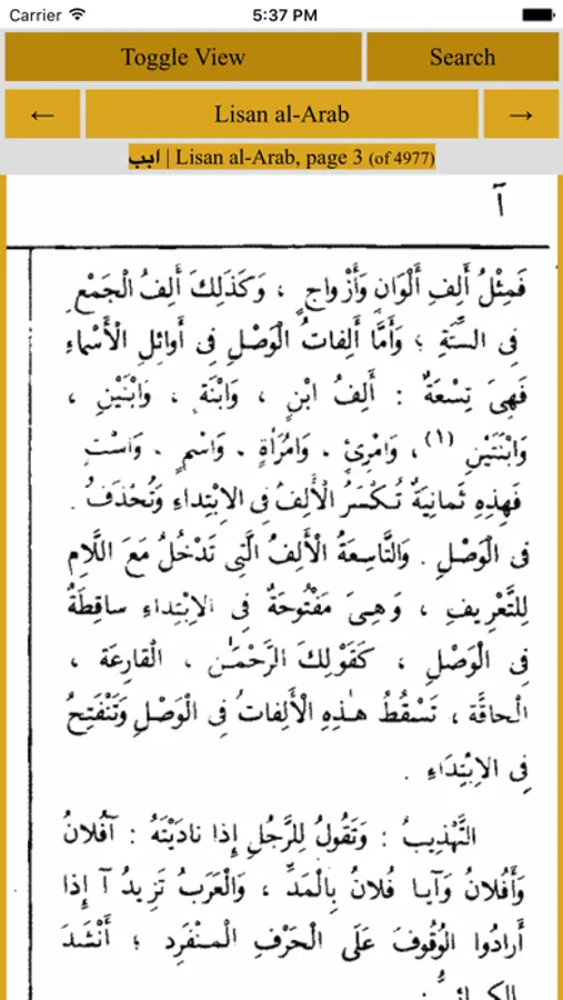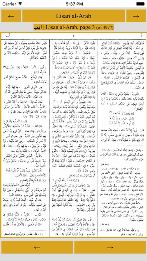 Lisan-al-Arab is now available on iOS. Featuring all 20 volumes, find the meaning and context of a word by searching for it's root letters. Written by ibn Manzur in 1290, Lisan-al-Arab is considered amongst one of the most comprehensive dictionaries written.