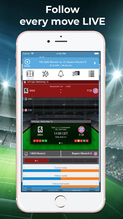 Next to the fastest, most accurate and most reliable sports news and results of your "Löwen", we also offer the opportunity to follow all players close to the action and without further delay. Our Live-Match-App is the most innovative and premium 2nd screen solution you can find in the AppStore and it allows you to follow not only the current results and stats, but also the live ball and player movement of your team everywhere on your mobile phone. This is the closest you can get without being live at the stadium!