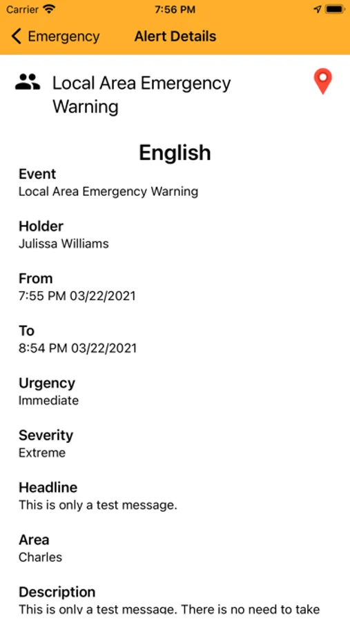 Emergency Alert Features (available for users who are 18 years old or older): sends alerts applicable to the area where the user is located, the user can enter information for a primary contact who can receive the user's location when the user is in an area of immediate high risk, the user can send their location to their primary contact at any time. The emergency alerts are originated by the US Integrated Public Alert and Warning System (IPAWS)