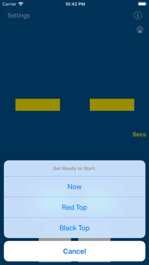 Start button gives three options: Now, Red or Black top. Where the countdown starts at either 5 seconds, seconds to next Red top or Black top respectively.