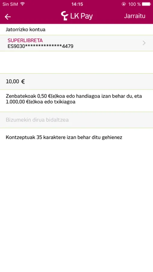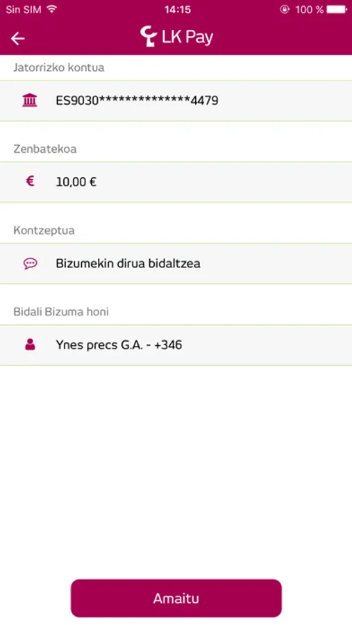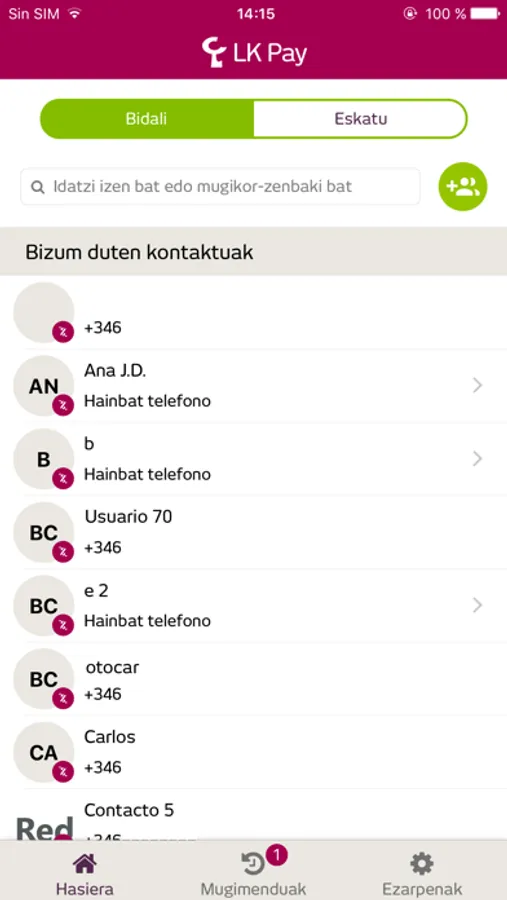o Dirua bidaltzea: Kontaktua hautatu eta zenbatekoa jarri ondoren, berehala bidaliko duzu dirua. Mugikorreko edozein zenbakitara ere bidali ahal izango duzu, nahiz eta ez egon zure kontaktuen artean.